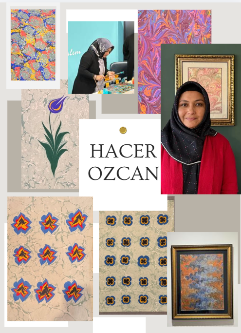 Hacer Özcan is a master of Ebru, the traditional Turkish art of water marbling. She is dedicated to preserving this centuries-old Islamic craft by teaching the delicate process of floating natural pigments on water to create intricate, "cloud-like" designs.